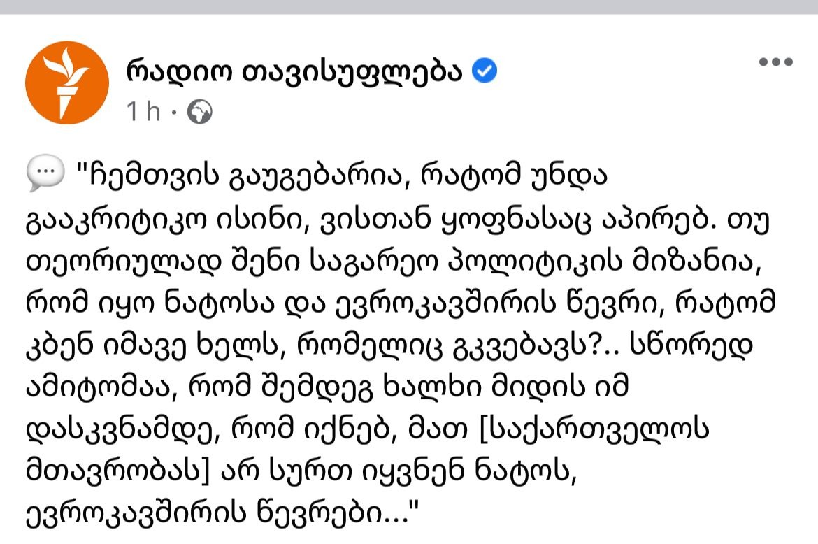 მადლობა ღმერთს, რომ ქართველი ერი თავისუფლების მოყვარე და ღირსების მქონე ერია, ძალიან კარგად არჩევს მეგობრებს და კოლონიალისტებს. არასოდეს არავის დავემონებით, საშუალოზე დაბალი დონის ფუნქციონერების ჭკუის დასარიგებელი ნაღდად არაფერი გვჭირს – ასე ეხმიანება ექსპერტი ლევან ნიკოლეიშვილი საქართველოში „ენდიაის“ ყოფილი დირექტორის ლორა თორნტონის ინტერვიუს, სადაც ამბობს, რომ მისთვის გაუგებარია, რატომ უნდა გააკრიტიკო ისინი, ვისთან ყოფნასაც აპირებ. როგორც ნიკოლეიშვილი აღნიშნავს, ლორა თორნტონის ამ თეორიას თუ გავყვებით, მას არათუ პარტნიორი, არამედ მონა სჭირდება. „ლორა თორნტონის ამ თეორიას თუ გავყვებით, მას არათუ პარტნიორი, არამედ მონა სჭირდება, რომელიც თურმე “გკვებავს” და ამიტომ, კრიტიკა დაუშვებელია. მადლობა ღმერთს, რომ ქართველი ერი თავისუფლების მოყვარე და ღირსების მქონე ერია, ძალიან კარგად არჩევს მეგობრებს და კოლონიალისტებს. არასოდეს არავის დავემონებით და მით უმეტეს მსგავსი, საშუალოზე დაბალი დონის ფუნქციონერების ჭკუის დასარიგებელი ნაღდად არაფერი გვჭირს“ – წერს ლევან ნიკოლეიშვილი Facebook-ზე.