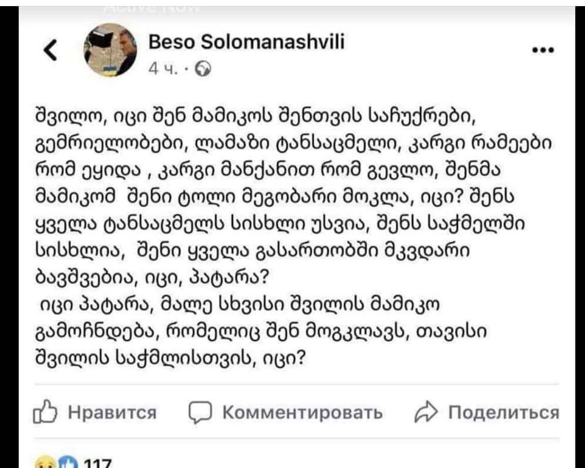 კულტურის მინისტრი თეა წულუკიანი ეხმიანება მწერალ ბესო სოლომანაშვილის ფეისბუქ პოსტს, რომელიც მან ვაკის პარკში მომხდარი ტრაგედიის შემდეგ დაწერა: