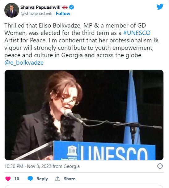 აღფრთოვანებული ვარ, რომ ელისო ბოლქვაძე იუნესკოს მშვიდობის არტისტად მესამე ვადით აირჩიეს, – განაცხადა საქართველოს პარლამენტის სპიკერმა, შალვა პაპუაშვილმა.