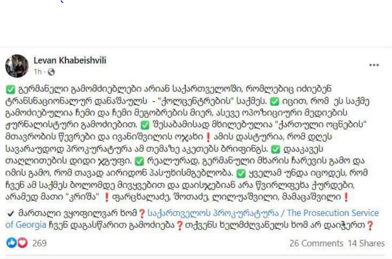 ამასთან, აზიარებს ლევან ხაბეიშვილის ფეისბუქ სტატუსის ე.წ. სქრინს და აღნიშნავს რომ ზუსტად იციან ამ ბანდის წევრებმა, რომ ყულფი მათ კისერზე უფრო და უფრო ვიწროვდება და მალე კეზერას ევროპელი პროკურორების საბრალდებო დასკვნას წაუკითხავენ!