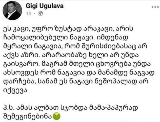 როგორი მდიდარი, კორექტული, აკადემიური და დიპლომატიური შეიძლება იყოს ნებისმიერი ენა – როდესაც შენ იცავ სამართლიანობას, შენს მხარეზეა ჭეშმარიტება და შენ დარწმუნებული ხარ შენს სიმართლეში. და როგორ ტრანსფორმირდება იგივე ენა, როდესაც შენ ცრუობ, მოკლებული ხარ არგუმენტაციას და შენი ბაგეებიდან გამოდის შენი დამარცხებული, ბინძური, გაავებული შიგთავსის ლინგვისტური სიმახინჯე. ირაკლი კობახიძეს რაც არ ეკუთვნის, იმ ეპითეტებს ვერც გაეკარება და ვერც შთანთქავს ბიუჯეტიდან 50 მილიონის ქურდისაგან, ან და კიდევ, ვანო მერაბიშვილის ყოფილი გამპრავებელი-“ანალიტიკოსის” მეუღლისაგან.