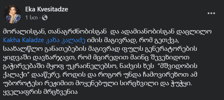 ეკა კვესიტაძემ კი კახა კალაძე გალანძღა, რადგან საახალწლო განათებების ფულით უკრაინელებს გენერატორები არ უყიდა და არ გაუგზავნა.