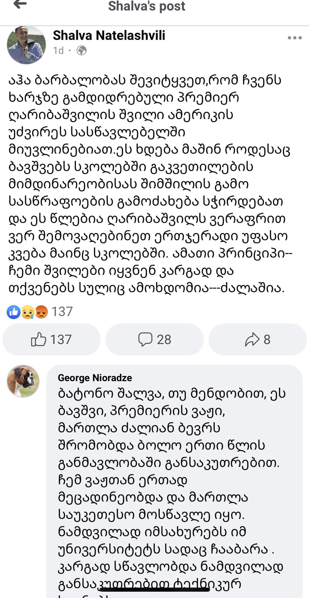 “ბატონო შალვა, თუ მენდობით, ეს ბავშვი, პრემიერის ვაჟი, მართლა ძალიან ბევრს შრომობდა ბოლო ერთი წლის განმავლობაში განსაკუთრებით. ჩემ ვაჟთან ერთად მეცადინეობდა და მართლა საუკეთესო მოსწავლე იყო. ნამდვილად იმსახურებს იმ უნივერსიტეტს სადაც ჩააბარა . კარგად სწავლობდა ნამდვილად განსაკუთრებით ტექნიკურ საგნებს”- წერს გიორგი ნიორაძე.