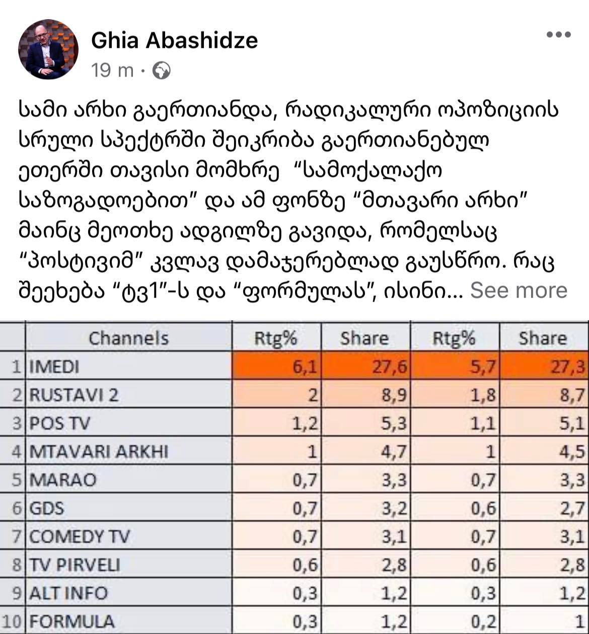 „სამი არხი გაერთიანდა, რადიკალური ოპოზიციის სრული სპექტრი შეიკრიბა გაერთიანებულ ეთერში თავისი მომხრე “სამოქალაქო საზოგადოებით” და ამ ფონზე “მთავარი არხი” მაინც მეოთხე ადგილზე გავიდა, რომელსაც “პოსტივიმ” კვლავ დამაჯერებლად გაუსწრო. რაც შეეხება “ტვ1”-ს და “ფორმულას”, ისინი მე-8 და მე-10 ადგილებს ინაწილებენ. “ტვ1”-ს უსწრებს “მარაო”, GDS და “კომედი ტვ”, ხოლო “ფორმულას” “ალტინფოც” კი.“ – წერს აბაშიძე.