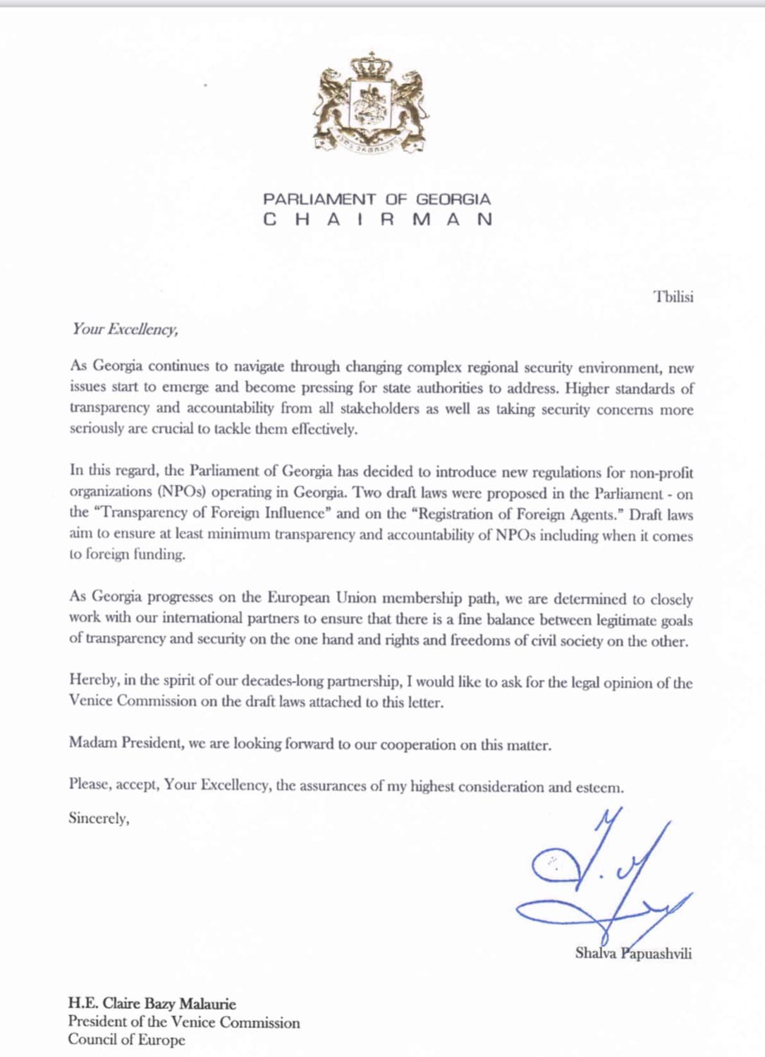საქართველოს პარლამენტის თავმჯდომარე შალვა პაპუაშვილმა ვენეციის კომისიის პრეზიდენტს წერილით მიმართა, რომელიც ეხება კანონპროექტის გაგზავნას უცხოური გავლენების განჭვირვალობასთან დაკავშირებით:
