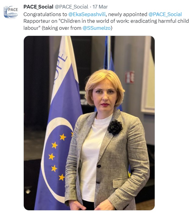 ევროპის საბჭოს საპარლამენტო ასამბლეის სოციალური საკითხების, ჯანმრთელობისა და მდგრადი განვითარების კომიტეტმა, ეკა სეფაშვილი ერთხმად აირჩია მომხსენებლად საკითხზე „ბავშვები სამუშაო სამყაროში: ბავშვთა მავნე შრომის აღმოფხვრა“