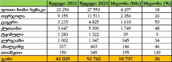 კობახიძე აქვეყნებს ცესკო-ს წინასწარი შედეგების ცხრილს, სადაც ასახულია როგორც 2023 წლის, ისე 2021 წლის მაჩვენებლები. ორივე არჩევნებში “ქართული ოცნების” წარმომადგენლების გამარჯვების გარდა, ცხრილში ნაჩვენებია მიმდინარე წელს ჩატარებულ არჩევნებში, მმართველი პარტიის მომატებული ხმების რაოდენობა.