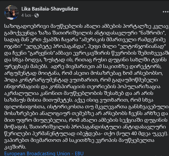 ექსპერტი ედიშერ გვენეტაძე ლიკა ბასილაია – შავგულიძის facebook სტატუსს ეხმიანება და აღნიშნავს, რომ საზოგადოებრივ მაუწყებელს” ბორდში ჰყავს ფაშისტი წევრი.
