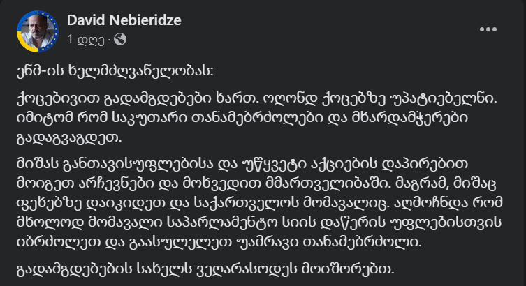 ენმ-ის ხელმძღვანელობას: “ქოცებივით” გადამგდებები ხართ. ოღონდ ქოცებზე უპატიებელნი. იმიტომ რომ საკუთარი თანამებრძოლები და მხარდამჭერები გადაგვაგდეთ. მიშას გათავისუფლებისა და უწყვეტი აქციების დაპირებით მოიგეთ არჩევნები და მოხვედით მმართველიბაში. მაგრამ, მიშაც ფეხებზე დაიკიდეთ და საქართველოს მომავალიც. აღმოჩნდა რომ მხოლოდ მომავალი საპარლამენტო სიის დაწერის უფლებისთვის იბრძოლეთ და გაასულელეთ უამრავი თანამებრძოლი. გადამგდებების სახელს ვეღარასოდეს მოიშორებთ.”- წერს ნებიერიძე.