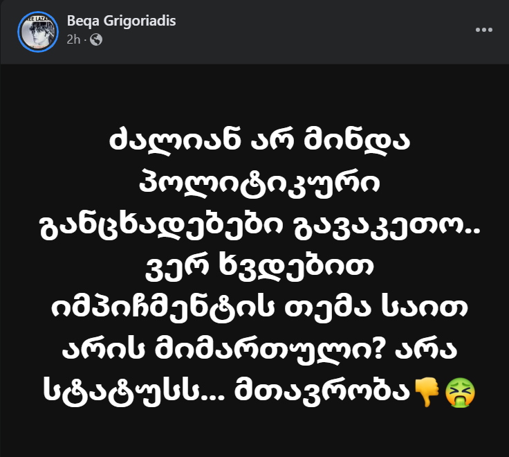 ბოლო სიახლე პოლიტიკა ბექა გრიგორიადისი თავს იკავებს პოლიტიკური განცხადება გააკეთოს პრეზიდენტის იმპიჩმენტზე მარშალ პრესი 01/09/2023 Facebook Messenger WhatsApp Viber Twitter LinkedIn ბექა გრიგორიადისი თავს იკავებს პოლიტიკური განცხადებას გააკეთოს პრეზიდენტის იმპიჩმენტზე. ამის შესახებ ის სოციალურ ქსელში წერს: Post navigation Previous: პოსტები “დამილაიქეთო”… იქნებ ეს პოსტიც დავულაიქოთ – გიორგი ვოლსკი სააკაშვილზეNext: სალომე ზურაბიშვილი შარლ მიშელს შეხვდა (ვიდეო)
