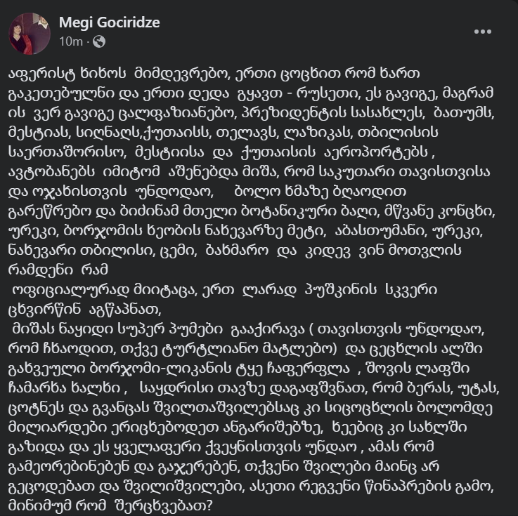 ბოლო სიახლე საზოგადოება მეგი გოცირიძემ კვლავ “გაჭედა” მარშალ პრესი 02/09/2023 Facebook Messenger WhatsApp Viber Twitter LinkedIn მიხეილ სააკაშვილის უფასო მხარდამჭერმა მეგი გოცირიძემ კვლავ “გაჭედა” და მორიგი პოსტი გამოაქვეყნა სოციალურ ქსელში, სადაც, ტრადიციულად ბიძინა ივანიშვილზე წერს: Post navigation Previous: კრაზანების ბუდე ჩამოიშალა! – ზურაბ ქადაგიძეNext: გიგი უგულავა განცხადებას ავრცელებს