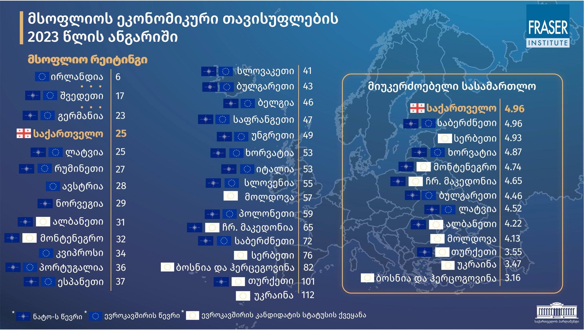 საქართველოს კიდევ ერთი მყარი წარმატება ობიექტურ ფაქტებში და არა სუბიექტურ აღქმებში. ფრეიზერის ინსტიტუტის მსოფლიოს ეკონომიკური თავისუფლების 2023 წლის ანგარიშის მიხედვით, საქართველო ორი საფეხურით დაწინაურდა და ევროპაში მე-15, ხოლო მსოფლიოში 25-ე ადგილზეა.”- წერს პარლამენტის თავმჯდომარე შალვა პაპუაშვილი სოციალურ ქსელში: