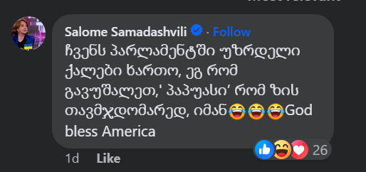 “ჩვენს პარლამენტში უზრდელი ქალები ხართო, ეგ რომ გავუშალეთ,’ პაპუასი’ რომ ზის თავმჯდომარედ, იმან. God bless America (ღმერთმა დალოცოს ამერიკა)”– წერს სალომე.