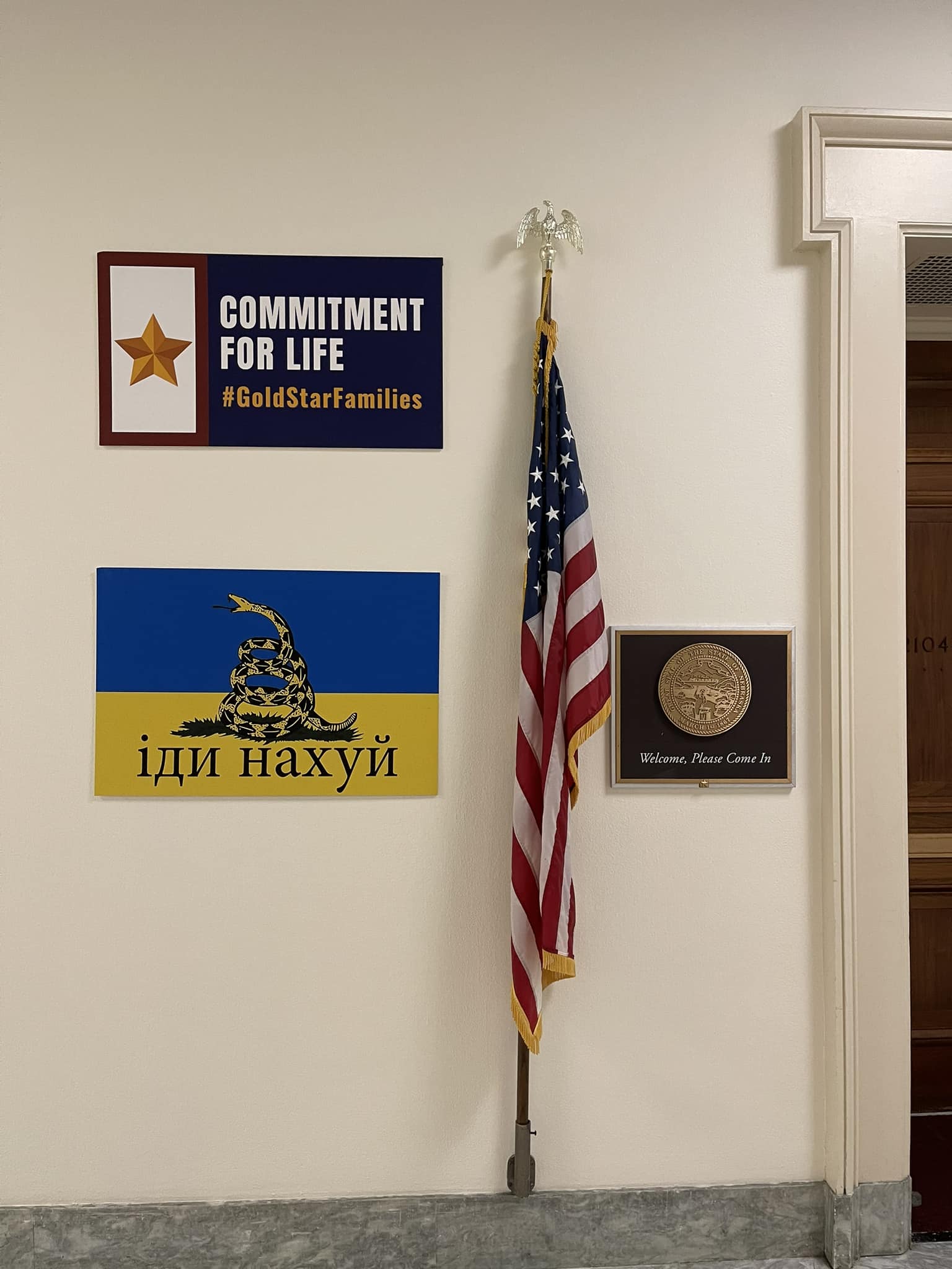 გვარამიამ ამერიკის კონგრესში გადაღებული ფოტო გამოაქვეყნა, სადაც კედელზე გაკრულია უკრაინის მხარდამჭერი ბანერი წარწერით “იდი ნა ხ..უი”.