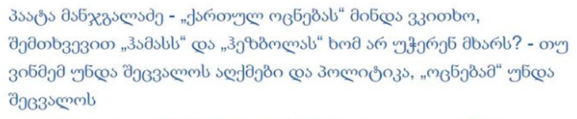 ეს ტრაგიკომიკური სუბიექტი მაოცებს, თან არც თუ ისე იშვიათად. მისი მცირე, მაგრამ მავნებლური აზროვნებით, თუ ვინმემ თუნდაც სრულიად ლეგიტიმურად ერთი შეკითხვა დასვა, ან უბრალოდ არ დაეთანხმა ამერიკელს ან ევროპელს, ის ავტომატურად „ჰამასის“ ან „ჰესბოლას“ მხარდამჭერია – ასე ეხმაურება „სტრატეგია აღმაშენებლის“ დეპუტატის, პაატა მანჯგალაძის განცხადებას.
