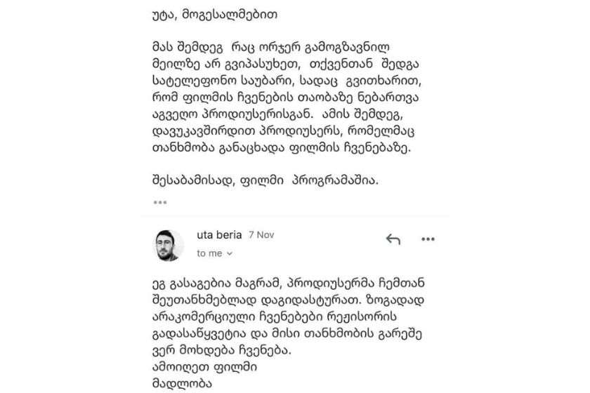 „კინოცენტრში მისვლისთანავე, ჩემი ერთ-ერთი პირველი ინიციატივა იყო რომ თანამედროვე ქართული ფილმების უფასო რეტროსპექტივა მოგვეწყო, რადგან ახალი ფილმები ქართველი მაყურებლისთვის უცნობი და ხელმიუწვდენელი იყო ამდენხანს და მსგავსი რეტროსპექტივაც არასოდეს გაკეთებულა. ამის ფარგლებში, ყველა მოაზრებული ფილმის რეჟისორს გავუგზავნეთ ნებართვის კეთილი ნების წერილი (კეთილი ნების იმიტომ, რომ კინოცენტრი ნებართვას პროდიუსერისგან იღებს მისი დაფინანსებული ფილმის ჩვენებაზე, რაც ძალზედ არასწორია – კინოცენტრს მისი დაფინანსებული ფილმის არაკომერციულ ჩვენებაზე ნებართვა ჭირდებოდეს – და აუცილებელია ამ წესის ცვლილება). ერთ-ერთმა ბოიკოტში მყოფმა რეჟისორმა, უტა ბერიამ, მას შემდეგ რაც არ უპასუხა ორჯერ მიწერილ მეილს, შემდგომ მასთან განხორციელებული სატელეფონო ზარისას განაცხადა, რომ ჩვენებაზე თანხმობას პროდიუსერი იძლევა და მისგან აიღეთ ნებართვაო. პროდიუსერმა ჩვენებაზე თანხმობა განაცხადა, რის შემდეგაც ფილმი ჩაჯდა პროგრამაში. პროგრამის გამოქვეყნების შემდეგ, ბოიკოტში მყოფმა სუბიექტებმა დაამუნათეს რეჟისორი, რატომ არის შენი ფილმი პროგრამაშიო, რის მერეც, დაგვდო პატივი და მოგვწერა, რომ არ იყო თანახმა ფილმის ჩვენებაზე. მას განემარტა, რომ სატელეფონო საუბარში თავადვე განგვიცხადა, მსგავს გადაწყვეტილებას ფილმის ჩვენების ნებართვაზე იღებდა პროდიუსერი, ხოლო პროდიუსერისგან ჩვენ გვქონდა თანხმობა.