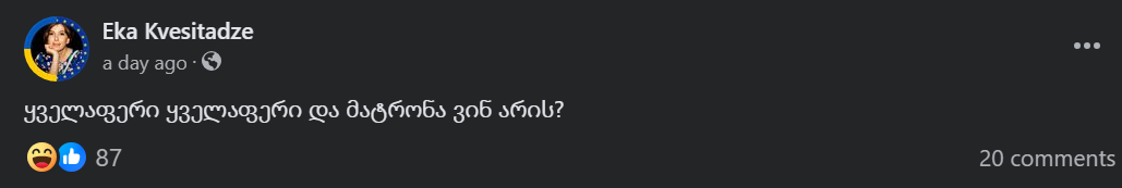 ბოლო სიახლე საზოგადოება ყველაფერი ყველაფერი და მატრონა ვინ არის? – ეკა კვესიტაძე მარშალ პრესი 08/01/2024 Facebook Messenger WhatsApp Viber Twitter LinkedIn “ყველაფერი ყველაფერი და მატრონა ვინ არის? – წერს ეკა კვესიტაძე სოციალურ ქსელში, რომელიც წმინდან მატრონასა ხატზე, სტალინთან შეხვედრის ეპიზოდთან დაკავშირებით ატეხილ აჟიოტაჟს ეხმიანება. Post navigation Previous: დასცინა საქართველოს მოსახლეობის 90%-ს – მამა იოვანე ლაშა ბუღაძეზეNext: არ უნდა დაგვავიწყდეს რომ ლაშა ბუღაძის მამა მგზნებარე კომუნისტი იყო – დაჩი ცაგურია