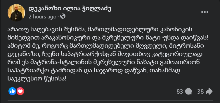 “არათუ საღებავის შესხმა, მართლმადიდებლური კანონიკის მიხედვით არაკანონიკური და მკრეხელური ხატი უნდა დაიწვას! ამიტომ მე, როგორც მართლმადიდებელი მღვდელი, მიტროსანი დეკანოზი, ჩვენი საპატრიარქოსგან მოვითხოვ კატეგორიულად რომ ეს მატრონა-სტალინის მკრეხელური ნახატი გამოათრიონ საპატრიარქო ტაძრიდან და საჯაროდ დაწვან, თანახმად საეკლესიო წესისა!”– წერს ჭიღლაძე.
