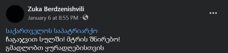 ბოლო სიახლე საზოგადოება საპატრიარქო, ჩაგა..ვით სულში – ზუკა ბერძენიშვილი მარშალ პრესი 23/01/2024 Facebook Messenger WhatsApp Viber Twitter LinkedIn საპატრიარქო. ჩაგა..ვით სულში”- წერს სოციალურ ქსელში ზუკა ბერძენიშვილი (დავით ბერძენიშვილის შვილი), რომელიც მატრონა მოსკოველის ხატზე სტალინთან შეხვედრის ეპიზოდს ეხმიანება. Post navigation Previous: გახარიამ და ნაცმოძრაობამ გადაწყვიტეს პოლიტიკური სატყუარა გადაუგდონ ხალხს და ურთიერთდაპირისპირება გაითამაშონNext: არ დავყაროთ კარვები და ლეიბები? – თაკო ჩარკვიანი