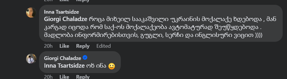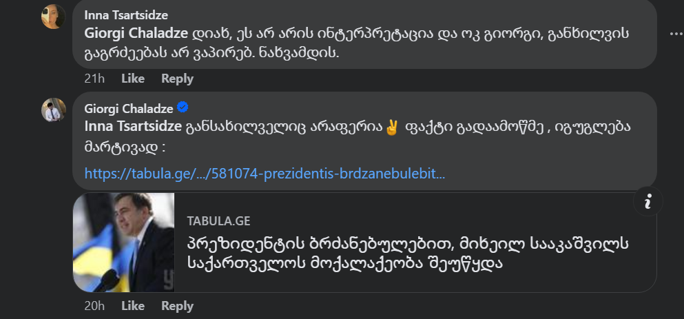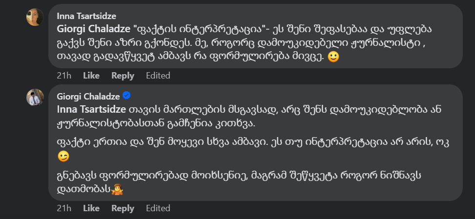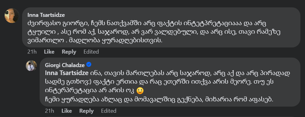 სად არის აქ დათმობა?”- მისწერა გიორგი ჩალაძემ ჟურნალისტს საჯარო კომენტარში, რაზეც მან უპასუხა: