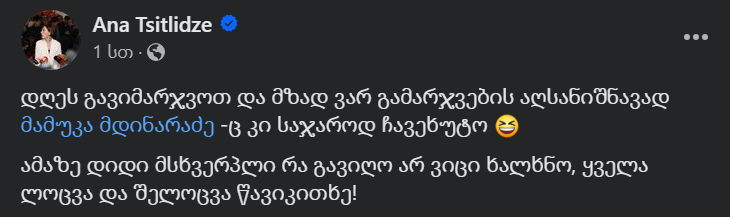 ნაციონალური მოძრაობის წევრ ანა წითლიძეს “ქართული ოცნების” ლიდერ მამუკა მდინარაძესთან ჩახუტება მოუწევს, ვინაიდან, წითლიძემ ფეისბუქზე დაწერა, რომ თუ საქართველო მოიგებდა საბერძნეთთან თამაშს, ის საჯაროდ ჩაეხუტებოდა მდინარაძეს, თუმცა, რას იზამს თავად მამუკა მდინარაძე, ეს ჯერ უცნობია.