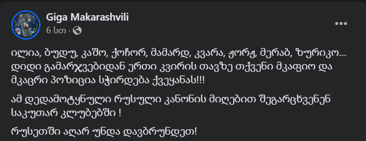 არასამთავრობოების და რიგი ოპოზიციური პარტიების განგაშის შემდეგ, საქმეში ერთვება უკრაინის მთავარი იმედი და გადარჩენა, არც მეტი, არც ნაკლები – გიგა მაქარაშვილი, რომელიც ამ კანონპროექტთან დაკავშირებით ქართველ ფეხბურთელებს მიმართავს.