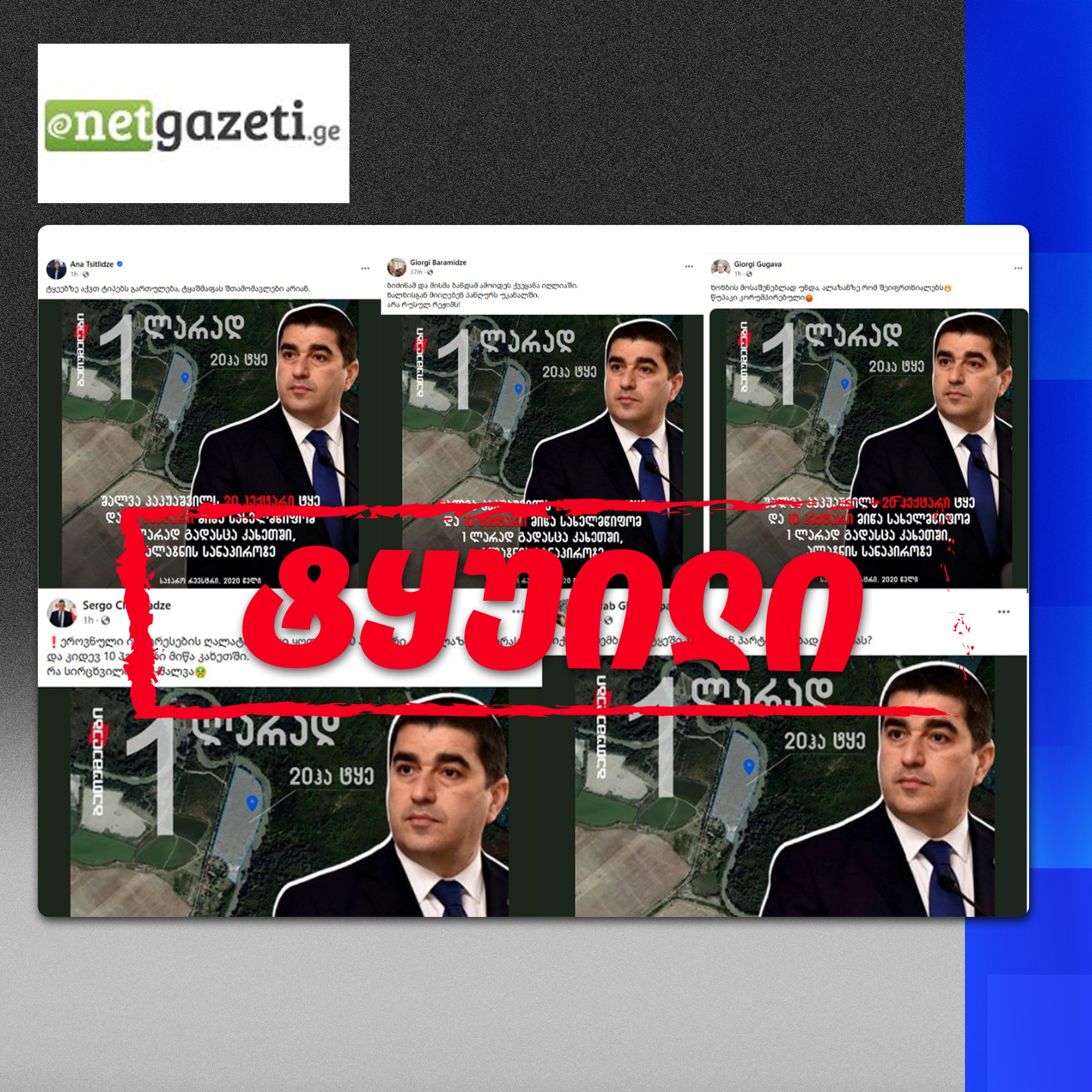 “ნეტგაზეთის” და „ბათუმელების“ მიერ გავრცელებული ეს ინფორმაცია, რა თქმა უნდა, აბსოლუტური ტყუილია.”- ასე ეხმიანება პარლამენტის თავმჯდომარე უცხოეთიდან დაფინანსებული მედიაგამოცემების მიერ გავრცელებულ ინფორმაციას მისთვის 20 ჰექტარი ტერიტორიის 1 ლარად მიყიდვასთან დაკავშირებით.