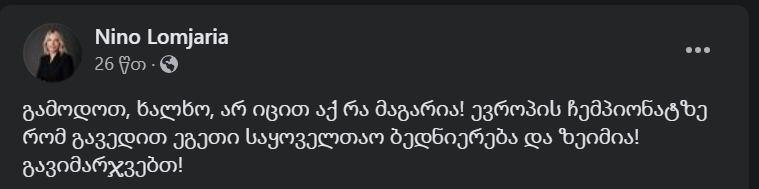 ბოლო სიახლე საზოგადოება გამოდით ხალხოოო, არ იცით რა მაგარია – ნინო ლომჯარიას პროვოკაციული მოწოდება მარშალ პრესი 01/05/2024 Facebook Messenger WhatsApp Viber Twitter LinkedIn ნინო ლომჯარია პროვოკაციულ სტატუსს აქვეყნებს სოციალურ ქსელში და ხალხს ქუჩაში გასვლისკენ მოუწოდებს. Post navigation Previous: ჯენზების თქმით, მათ არაფრის არ ეშინიათNext: საყოველთაო-სახალხო შეკრებამ ჭკუიდან გადაიყვანა ცალკე “ნაცები”, ცალკე არასამთავრობოები