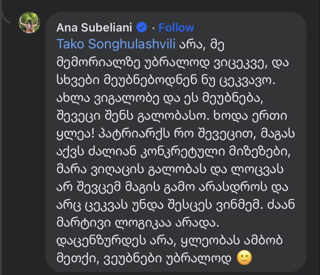 “პატრიარქს რომ შევეცით, მაგას აქვს ძალიან კონკრეტული მიზეზები”. “მე მემორიალზე უბრალოდ ვიცეკვე, და სხვები მეუბნებოდნენ ნუ ცეკვავო. ახლა ვიგალობე და ეს მეუბნება, შევეცი შენს გალობასო. ხოდა ერთი ყლეა! პატრიარქს რო შევეცით, მაგას აქვს ძალიან კონკრეტული მიზეზები, მარა ვიღაცის გალობას და ლოცვას არ შევცემ მაგის გამო არასდროს და არც ცეკვას უნდა შესცეს ვინმემ. ძაან მარტივი ლოგიკაა არადა. დაცენზურდეს არა, ყლეობას ამბობ მეთქი, ვეუბნები უბრალოდ.” – წერს ანა სუბელიანი.