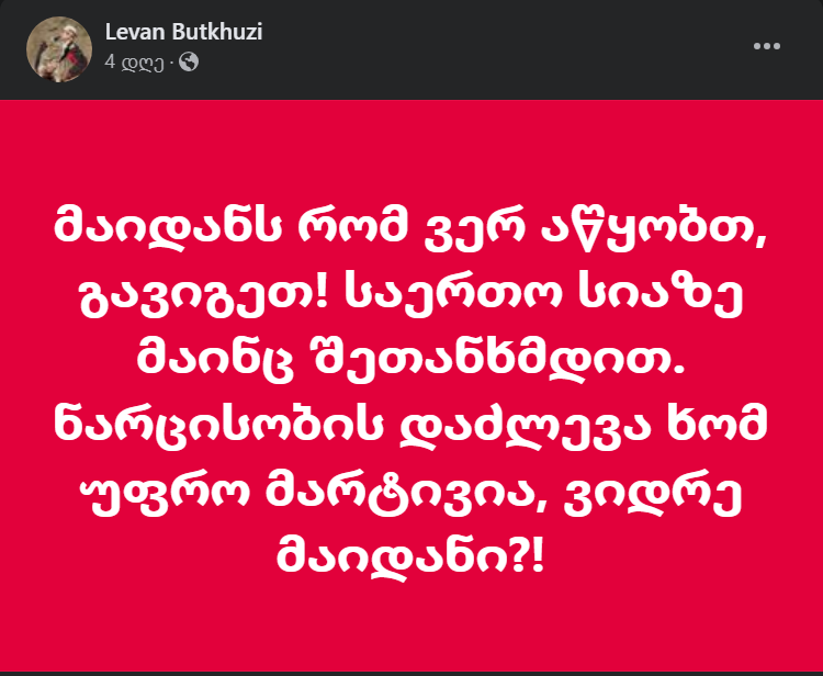 მაიდანს რომ ვერ აწყობთ, გავიგეთ! საერთო სიაზე მაინც შეთანხმდით. ნარცისობის დაძლევა ხომ უფრო მარტივია, ვიდრე მაიდანი?!”- წერს სოციალურ ქსელში ტერმინ “გეი რევოლუციის” ავტორი ლევან ბუთხუზი, რომელიც ასევე უერთდება გამჭვირვალობის კანონპროექტის მოწინააღმდეგეებს.