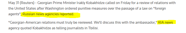 „საერთაშორისო მედიასაშუალება „როიტერი“ საქართველოს პრემიერ-მინისტრ ირაკლი კობახიძის განცხადებას კონტექსტიდან ამოგლეჯილი ფორმით ავრცელებს, სადაც შინაარსის გარეშე წერია, თითქოს ირაკლი კობახიძე ქართულ-ამერიკული ურთიერთობების გადახედვის საჭიროებაზე საუბრობს. სტატია და განსაკუთრებით მისი ჰედლაინი ტოვებს აღქმას, ვითომდა საქართველოს პრემიერი „ურთიერთობების გადახედვას“ ნეგატიურ კონტექსტში ახსენებს.