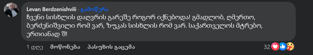 “ჩვენი სისხლის დაღვრის გარეშე როგორ იქნებოდა! გმადლობ, ღმერთო, ბერძენიშვილი რომ ვარ, ზუკას სისხლის რომ ვარ. საქართველოს მტრებო, ერთიანად შ!” – წერს ლევან ბერძენიშვილი მისი ძმისშვილის, ზუკა ბერძენიშვილი ცემის ფაქტთან დაკავშირებით ფეისბუქ პოსტის კომენტარში.