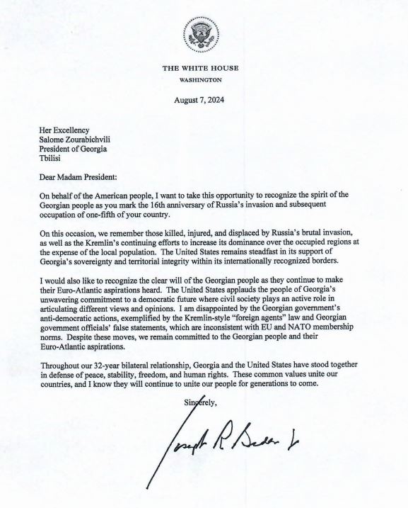 32 წლიანი ორმხრივი ურთიერთობის განმავლობაში საქართველო და შეერთებული შტატები ერთად ვიცავთ მშვიდობას, სტაბილურობას, თავისუფლებასა და ადამიანის უფლებებს. ეს საერთო ღირებულებები აერთიანებს ჩვენს ქვეყნებს და ვიცი, რომ ეს ღირებულებები მომავალშიც გააერთიანებს ჩვენს ხალხებს.”- ნათქვამია ჯო ბაიდენის სახელით შედგენილ წერილში.