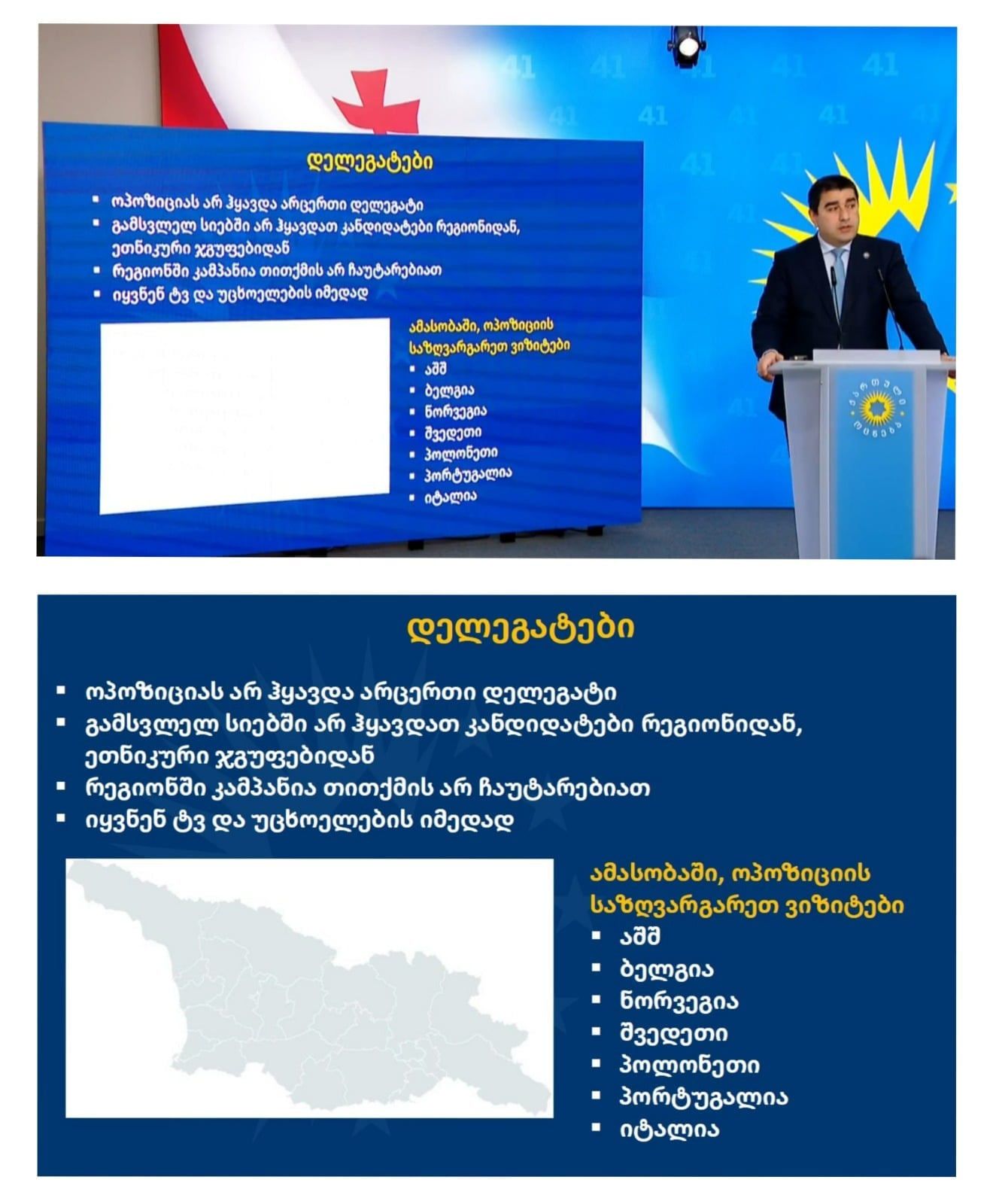 „თუ დავუჯერებთ ფსევდორელიგიური ფანატიკოსების აღქმებს და ტელევიზორებს, შემდეგ სლაიდზე, რომელზეც ჩანს რომ ოპოზიციას არცერთ ოლქში დელეგატი არ დაუსახელებია, საქართველო სრულად აღმიგვია პირისაგან მიწისა.