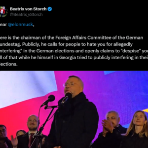 ბუნდესტაგის წევრი, ბეატრიქს ფონ შტორჰი, თბილისში ოპოზიციის აქციაზე მყოფი მიხაელ როთის ვიდეოს სოციალურ ქსელში აქვეყნებს და ილონ მასკს მიმართავს.