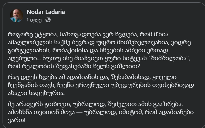 “როგორც ეტყობა, საზოგადოება ვერ ხვდება, რომ მზია ამაღლობელის საქმე ბევრად უფრო მნიშვნელოვანია, ვიდრე გირგვლიანის, რობაქიძისა და სხვების ამბები ერთად აღებული… ნუთუ ისე მიაჩვიეთ ყური სიტყვას “შიმშილობა”, რომ რეალობის შეფასებაში ხელს გიშლით?- წერს სოციალურ ქსელში სააკაშვილის კარის ექსპერტი ნოდარ ლადარია.