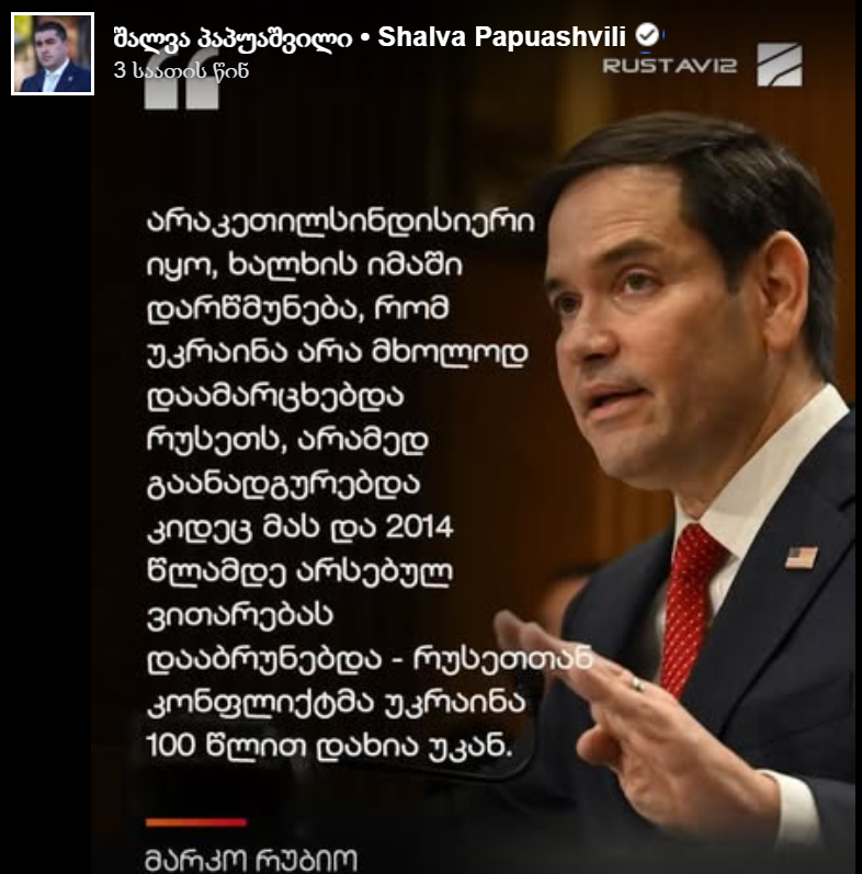 „თუკი ვინმე ისევ კითხულობს, რას ნიშნავდა უკრაინიზაცია. ამას”, – წერს შალვა პაპუაშვილი და რუბიოს განცხადებას აზიარებს.