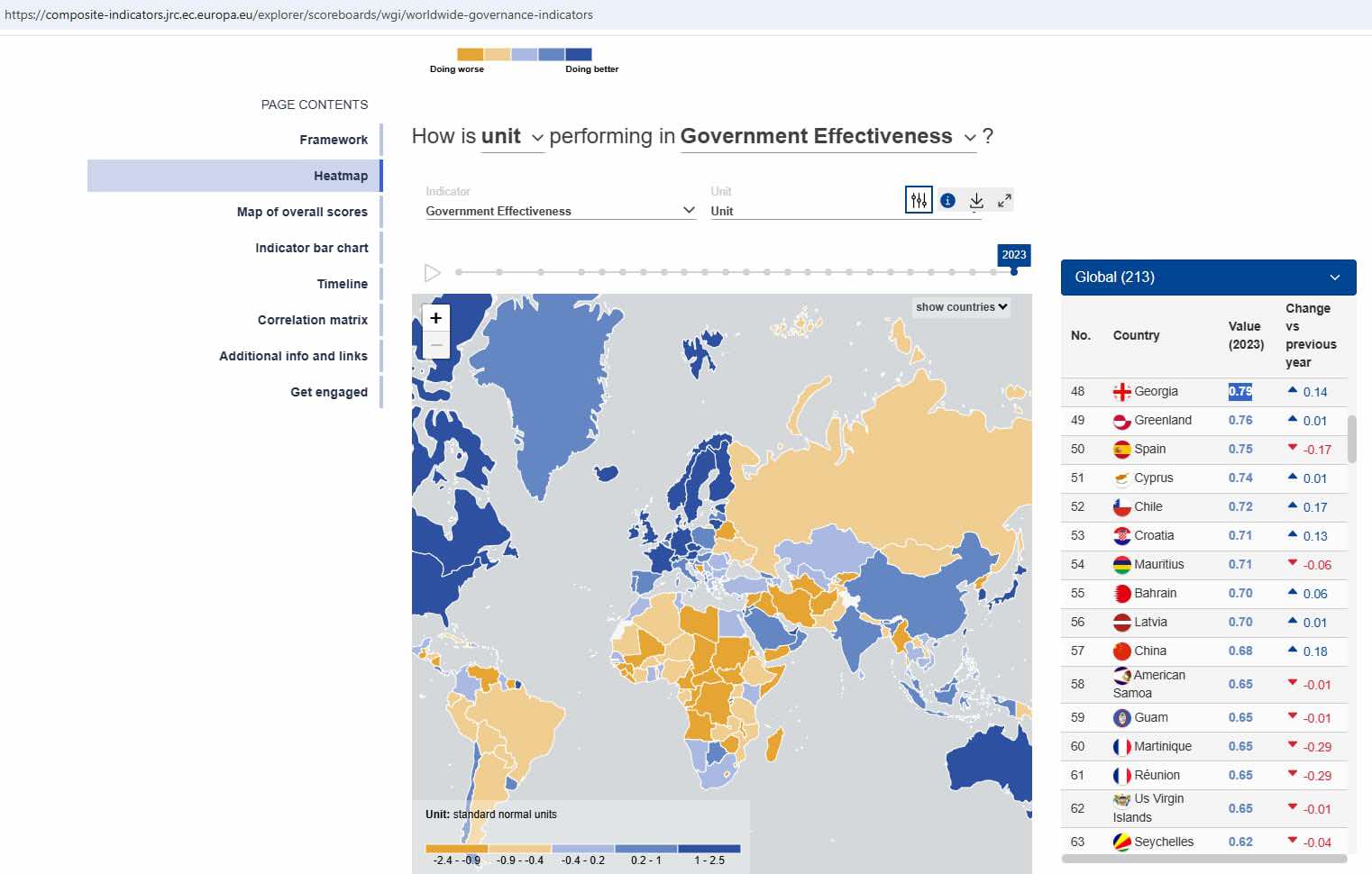 ევროკომისია გლობალური მმართველობის ინდიკატორების 2024 წლის გამოშვების ფარგლებში მთავრობის ეფექტიანობის ინდექსს აქვეყნებს, რომელიც მსოფლიოს 213 ქვეყნისა და ტერიტორიის შეფასებას მოიცავს. საქართველოს მთავრობამ შეფასების 100 პროცენტიანი სისტემით, ახალი ისტორიული მაქსიმუმი_77,8% მიიღო და 50 საუკეთესოს შორის მოხვდა.