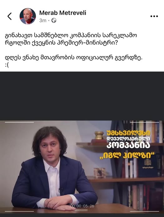 ექსპერტი დავით ჩიხელიძე სოციალურ ქსელში ჟურნალისტ მერაბ მეტრეველს მის მიერ გაზიარებულ “სქრინზე” პასუხობს, რომ “პრემიერი არა ვინმეს რეკლამაში მონაწილეობს, არამედ რადგან საზოგადოებაში კითხვის ნიშნები გაჩნდა 6.6 მილიარდიან ინცესტიციაზე- დაჯდა და ხალხს დეტალური ინფორმაცია მიაწოდა”.