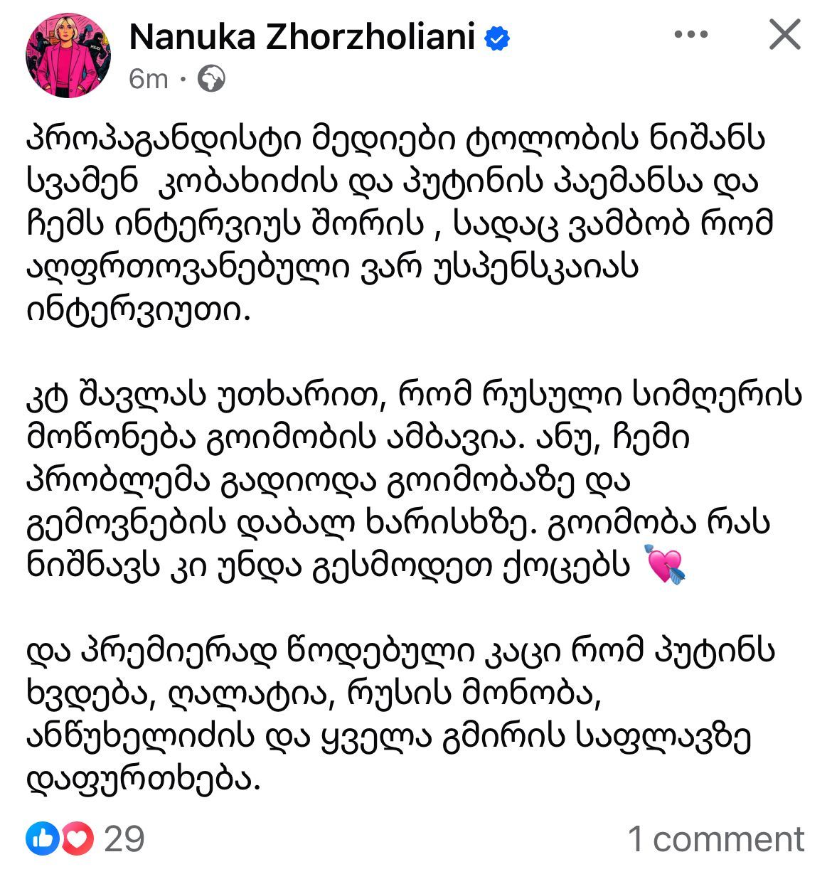 Postv-ის გენერალური პროდიუსერი შალვა რამიშვილი ნანუკა ჟორჟოლიანს ფეისბუქ პოსტზე პასუხობს. ჟორჟოლიანი თავის პოსტში წერს, რომ „რუსული სიმღერის მოწონება გოიმობის ამბავია და პრემიერად წოდებული კაცი რომ პუტინს ხვდება, ღალატია“.