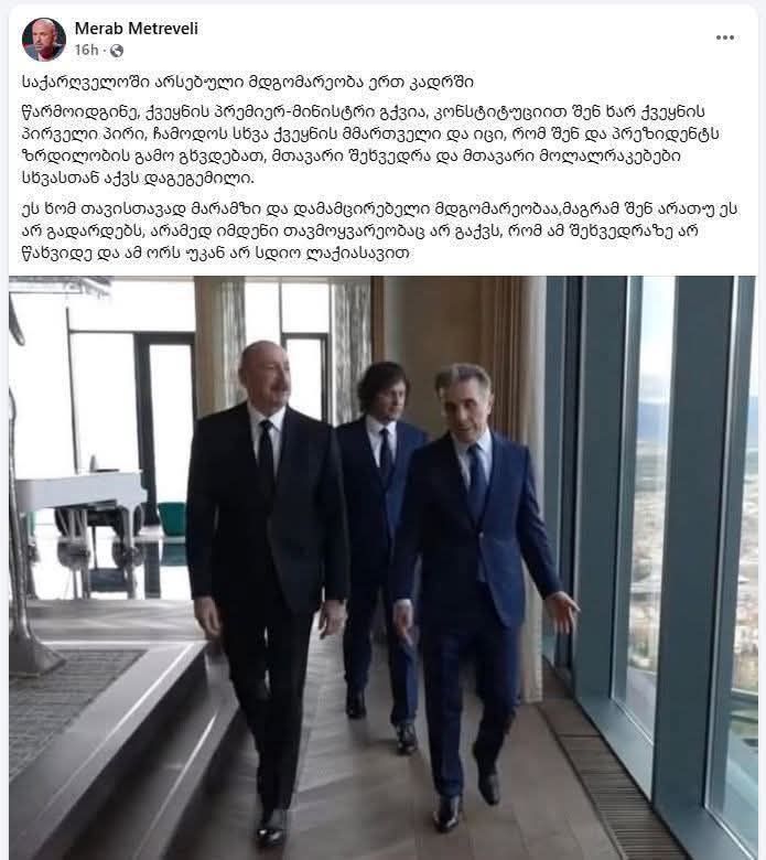 საზოგადოება ადამის დროიდან ვამბობდი, რომ ბატონი მერაბი მეტრეველი დაუბანელი ყ..ა-თქო – გიორგი გამსახურდია მარშალ პრესი 07/04/2026 ადამის დროიდან ვამბობდი, რომ ბატონი მერაბი მეტრეველი დაუბანელი ყ..ა-თქო. პირადადაც მოვახსენე, მაგრამ დამბლოკა. იმედს ვიტოვებ, რომ გადასცემენ. ვადასტურებ იგივეს ბატონო მერაბ”- წერს გიორგი გამსახურდია სოციალურ ქსელში. Post navigation Previous: აკადემიკოს ვახტანგ შამილაძის სახელობის სტუდენტთა ხელშეწყობის პროგრამის ფარგლებში, საკონკურსო კომისიის გადაწყვეტილებით, 109 წარმატებული სტუდენტი დაფინანსდებაNext: ირაკლი კობახიძე ძალიან გავლენიან, მძიმეწონიან პოლიტიკოსად ჩამოყალიბდა, “დიფ სთეითისა” და მათი აქაური აგენტურის მთელი ძალისხმევა მომართულია მის საწინააღმდეგოდ
